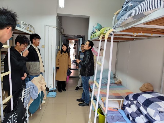 走訪過程中,丁增武院長對宿舍干凈整潔的環(huán)境表示了肯定和贊揚。他非常關(guān)心同學們在學校的學習情況,積極詢問同學們在生活和學習中遇到的困難,鼓勵同學們培養(yǎng)適合自己的學習習慣和方法,做好時間規(guī)劃,躬行實踐,將個人所學知識與社會發(fā)展需要緊密結(jié)合起來。他希望同學們保持樂觀向上的生活態(tài)度,在日常生活中多和學院同學交流,積極參與學院各類活動,建立和諧融洽的人際關(guān)系,共同營造良好的學習、生活環(huán)境。
