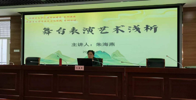 10月16日上午,語言文化與傳媒學(xué)院“漢語言文學(xué)一流專業(yè)建設(shè)系列講座”拉開帷幕。首場講座題為“舞臺表演藝術(shù)淺析”,特邀講座人是國家一級演員,文化部優(yōu)秀專家、安徽省話劇院原院長朱海燕。語言文化與傳媒學(xué)院副院長殷明明,中文系師生100余人聆聽講座。