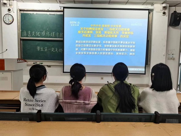 為深入學(xué)習(xí)習(xí)近平新時代中國特色社會主義思想,全面貫徹黨的二十大精神,大力弘揚“兩彈一星”精神和載人航天精神,10月20日,語言文化與傳媒學(xué)院學(xué)生第一黨支部在善思樓c座5棟101教室召開學(xué)習(xí)會議,會議由學(xué)生副書記主持,支委成員參加。