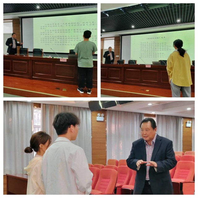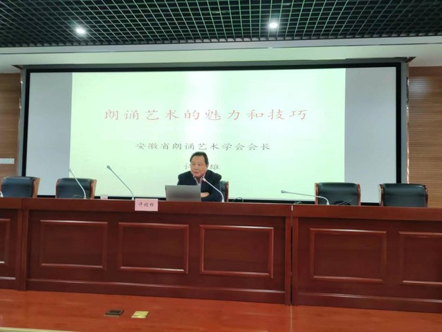 許北雄教授曾任安徽演藝集團(tuán)藝術(shù)總監(jiān),安徽省徽京劇院院長(zhǎng),安徽省話劇團(tuán)副團(tuán)長(zhǎng),現(xiàn)為安徽朗誦藝術(shù)學(xué)會(huì)會(huì)長(zhǎng),是安徽省話劇表演、播音主持、朗誦藝術(shù)等領(lǐng)域領(lǐng)軍人物和代表人物,曾獲安徽省播音主持一等獎(jiǎng)、安徽省藝術(shù)節(jié)表演一等獎(jiǎng)等諸多獎(jiǎng)項(xiàng)。講座開(kāi)始后,許教授從個(gè)人經(jīng)歷、作品展示、經(jīng)驗(yàn)分享、朗誦技巧等方面向大家多角度、全方位地介紹了朗誦這門語(yǔ)言藝術(shù),深入淺出地告訴同學(xué)們朗誦前應(yīng)做何種準(zhǔn)備工作、如何充分把握作品內(nèi)容、怎樣用聲音充分演繹出作品的內(nèi)涵以及怎樣塑造鮮活的人物形象,并重點(diǎn)傳授了朗誦的表現(xiàn)手段和基本方法,令人受益匪淺。