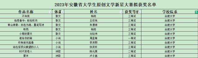 2023年安徽省大學(xué)生原創(chuàng)文學(xué)新星大賽擬獲獎(jiǎng)名單于12月18日揭曉,合肥大學(xué)參賽選手喜獲佳績,包括一等獎(jiǎng)1項(xiàng),二等獎(jiǎng)1項(xiàng),三等獎(jiǎng)8項(xiàng)。語言文化與傳媒學(xué)院李慶霞老師獲得優(yōu)秀指導(dǎo)教師獎(jiǎng)。