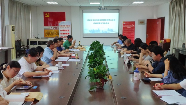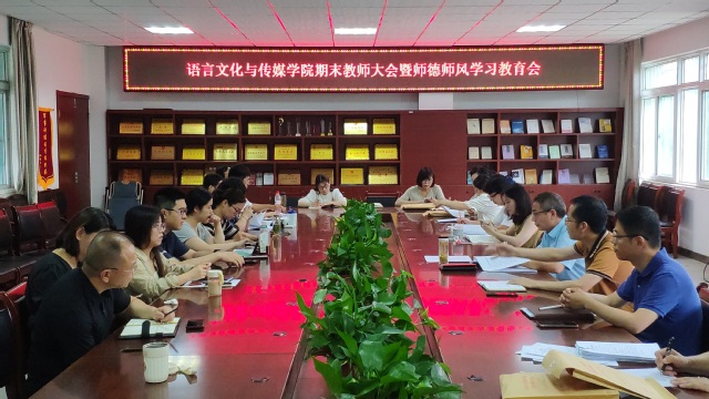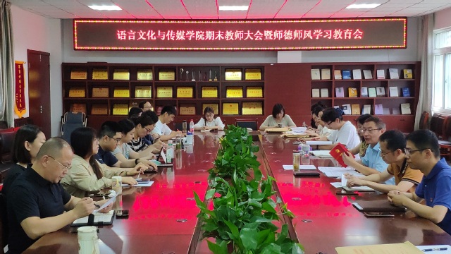 7月10日上午,語言文化與傳媒學院在五棟二樓會議室舉行了全體教師大會暨期末師德師風學習教育會,學院領導班子成員及全體教職工參加會議。