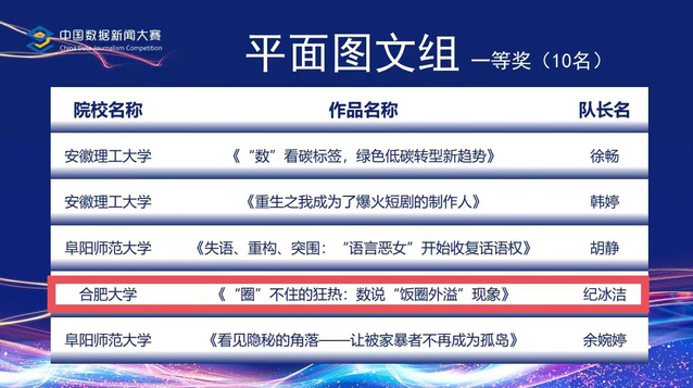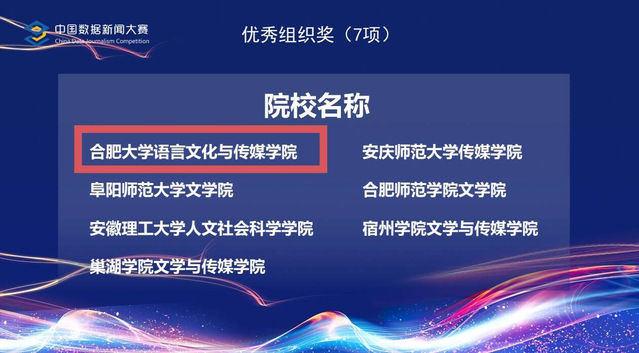 合肥大學語言文化與傳媒學院素來重視應用型新聞傳播人才的培養(yǎng),以學科競賽為抓手,從資金、人員、場地、政策等方面給予全力支持,助力廣大學子參與各類競賽。今年6月組委會公布大學生數(shù)據(jù)新聞大賽的賽事信息后,學院立即組織師生開始比賽籌備工作,參賽隊伍在創(chuàng)意策劃、動圖設計、文案編寫、視頻拍攝、可視化呈現(xiàn)等各個環(huán)節(jié)認真準備,學院老師全程悉心指導,帶領同學們將理論學習和實踐探索相結合,大大提升了學生的創(chuàng)新意識與動手能力。