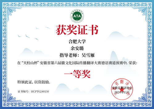近日,天柱山杯第六屆徽文化國際傳播翻譯大賽預賽成功舉行。外國語學院德語專業(yè)53同學參加,一等獎1名、二等獎6名、三等獎15名、優(yōu)秀獎17其中余安璐同學將代表合肥大學參加天柱山杯第六屆徽文化國際傳播翻譯大賽德語賽道決賽,與其他優(yōu)秀選手同臺競技。
