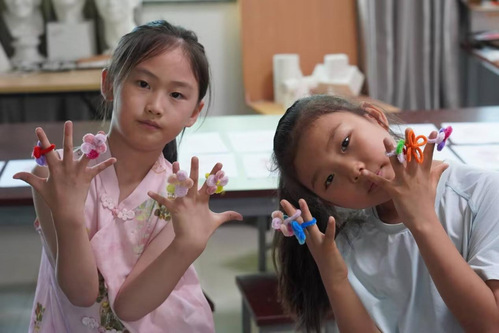活動現(xiàn)場,志愿者小老師和孩子們圍坐在一起。在制作扭扭棒作品時,小老師們手把手指導,從扭扭棒的彎折塑形到色彩搭配,一步步帶領孩子學習與探索。孩子們手中的扭扭棒像被施了魔法,一只只靈動的花朵戒指、一朵朵別致的花朵手環(huán)漸漸成型?,F(xiàn)場氣氛熱烈。專注的神情、嘗試新造型時的興奮,讓課堂滿是童真與活力,在鄉(xiāng)村夏日繪出創(chuàng)意滿滿的畫面。
