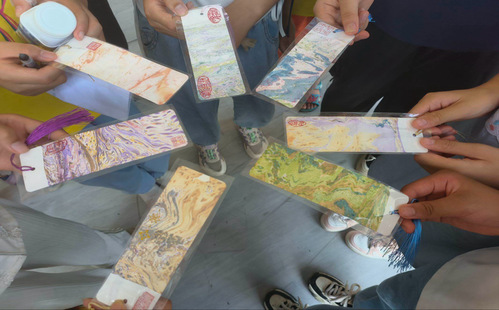 此外,團隊還精心設計了漂漆書簽DIY活動。在志愿者小老師們的指導下,孩子們運用手中的顏料,在書簽上暈染出五彩斑斕的圖案和美麗的風景,將漂漆這項傳統(tǒng)非遺文化與現(xiàn)代藝術完美融合。孩子們在創(chuàng)作中不僅鍛煉了動手能力,還加深了對傳統(tǒng)文化的理解和熱愛。