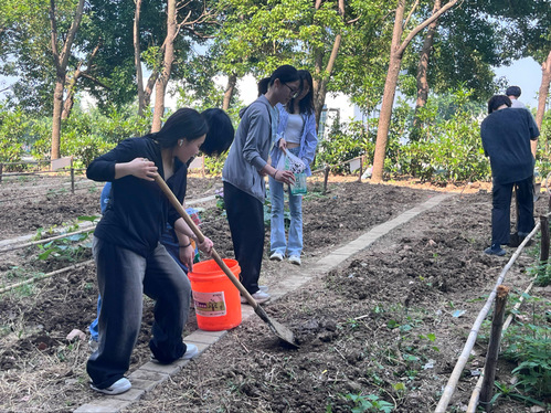 外國語學院志愿者們手持鋤頭、種子和肥料,臉上洋溢著青春的熱情和活力。他們分工明確,有的負責鋤地,有的負責撒種,有的則忙著施肥和澆水。在這片土地上,他們用自己的雙手為校園增添了一抹綠色。