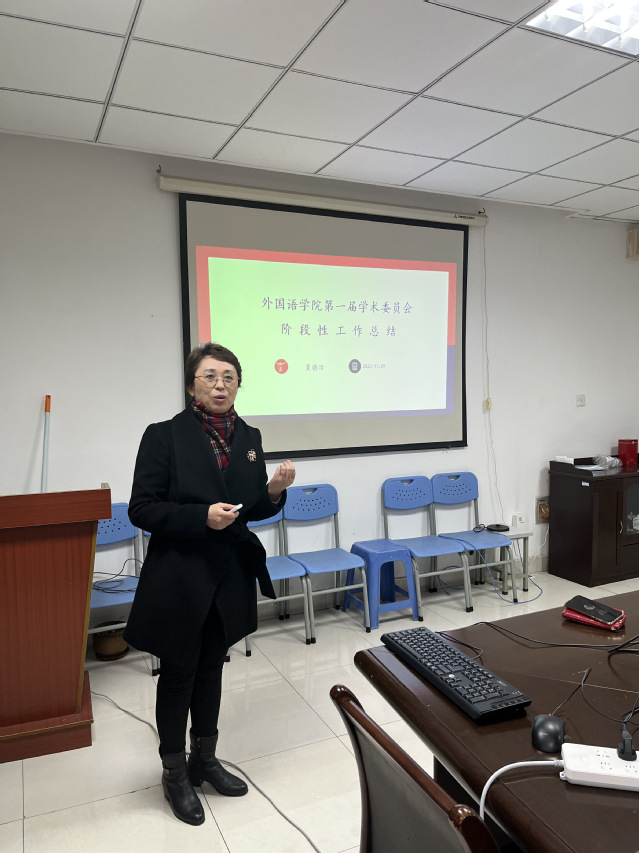 外國語學(xué)院學(xué)術(shù)委員會(huì)主任夏蓓潔教授做了外國語學(xué)院第一屆學(xué)術(shù)委員會(huì)階段性工作總結(jié)。夏教授介紹了學(xué)術(shù)委員會(huì)的人員構(gòu)成、宗旨和工作流程,重點(diǎn)梳理總結(jié)了學(xué)術(shù)委員會(huì)的八項(xiàng)常規(guī)工作,在肯定學(xué)術(shù)委員會(huì)成績(jī)的同時(shí)也提出了下一步的工作方向。