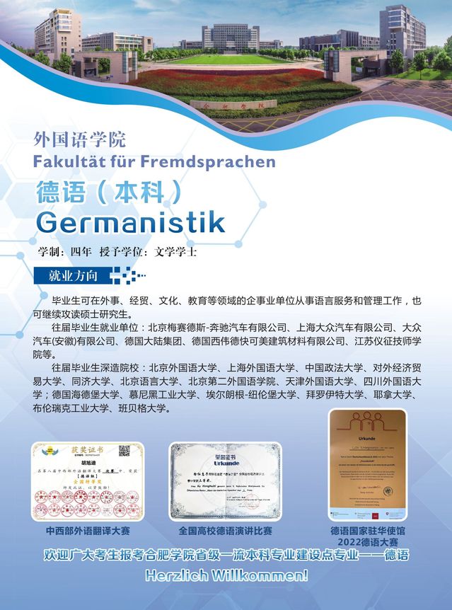 畢業(yè)生可在經(jīng)貿(mào)、教育、外事、文化、教育等領(lǐng)域的企事業(yè)單位從事德語語言服務(wù)、涉外工作以及德語教育,在勝任目前崗位的基礎(chǔ)上具備擔(dān)任項(xiàng)目管理和成為業(yè)務(wù)骨干的能力,能根據(jù)工作崗位的需要獲得相應(yīng)的專業(yè)職稱(翻譯、外企行政及人事管理專員等),也可繼續(xù)攻讀碩士學(xué)位研究生或出國(guó)深造。