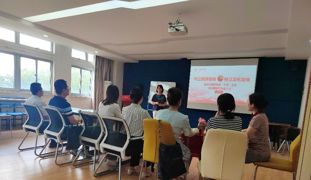 為全面推動習(xí)近平新時代中國特色社會主義思想進教材、進課堂、進頭腦,全面深入準(zhǔn)確學(xué)習(xí)領(lǐng)會習(xí)近平新時代中國特色社會主義思想的理論品格和精髓要義,自信自強做好黨的二十大精神理論武裝,2023年6月20日下午,外國語學(xué)院黨委統(tǒng)戰(zhàn)委員、副院長李潔給教工第二黨支部全體黨員講授了題為“樹立民族自信,樹立文化自信——推動外國語學(xué)院‘三進’工作,培養(yǎng)新時代外語人才”的專題黨課。
