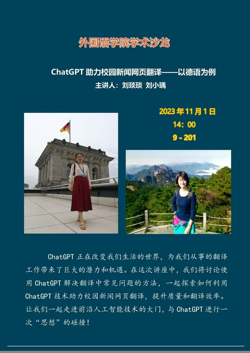 111日下午,外國語學(xué)院學(xué)術(shù)委員會舉辦了一場以“ChatGPT助力校園新聞稿翻譯——德語為例”為主題的學(xué)術(shù)分享活動,旨在探索先進(jìn)的人工智能翻譯技術(shù)在校園新聞稿翻譯中的應(yīng)用。學(xué)術(shù)活動由院學(xué)術(shù)委員會主任方芳主持,劉琰琰和劉小瑀兩位德語教師分享了結(jié)合人工及機(jī)器翻譯優(yōu)勢,使用ChatGPT提升校園新聞稿翻譯質(zhì)量方面的最新學(xué)習(xí)及研究成果。外國語學(xué)院英語及德語翻譯團(tuán)隊教師參與了本次學(xué)術(shù)活動。