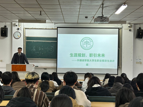 11月23日下午4時(shí),外國語學(xué)院于一期5棟101教室舉行了秋季學(xué)期企業(yè)高管進(jìn)校園活動(dòng)。此次活動(dòng)特別邀請(qǐng)安徽來盛日語培訓(xùn)學(xué)校的人事經(jīng)理趙康為全體大一新生開展了職業(yè)生涯規(guī)劃講座。參加講座的還有外國語學(xué)院張正華及王雨濛老師。