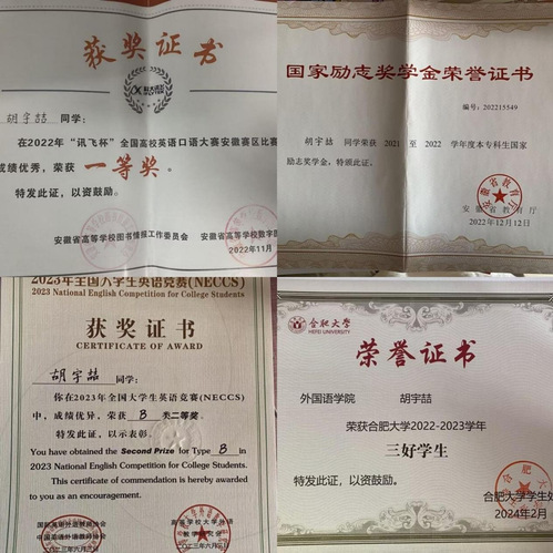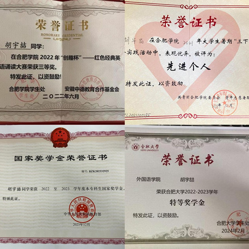 除了刻苦學(xué)習(xí)書本知識以外,她積極參與各類學(xué)術(shù)競賽,開闊眼界、豐富閱歷,并憑借扎實(shí)的知識儲備和敏銳的思維能力,在競賽中屢創(chuàng)佳績。曾獲得2022年“訊飛杯”全國高校英語口語大賽省級一等獎(jiǎng)、大學(xué)生英語競賽B類二等獎(jiǎng)等。這些榮譽(yù)的背后,是無數(shù)個(gè)日夜的努力和汗水的積累。此外,她熱衷于參加各項(xiàng)文藝活動(dòng),榮獲2022年合肥學(xué)院第十九屆校園文化藝術(shù)節(jié)一等獎(jiǎng)。