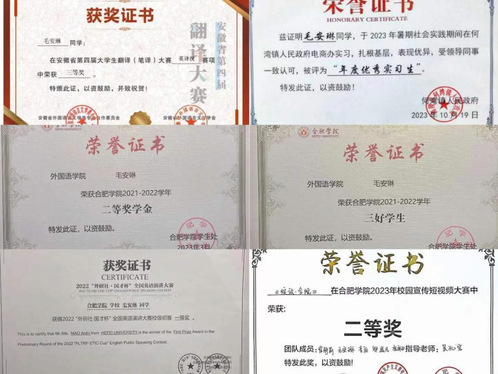 在校期間,毛安琳同學(xué)積極參加各項(xiàng)志愿服務(wù),2022年世界制造業(yè)大會(huì)“優(yōu)秀志愿者”、全國(guó)中學(xué)生英語(yǔ)能力測(cè)評(píng)“優(yōu)秀志愿者”、臨湖社區(qū)愛心學(xué)堂“年度優(yōu)秀志愿者”等稱號(hào),參與2022年合肥市新能源汽車全球人才招聘會(huì)、2023年中國(guó)航天日志愿服務(wù)以及海恒社區(qū)青春助力志愿服務(wù)等社會(huì)實(shí)踐三十余項(xiàng),均取得出色成果。除此之外,她還帶隊(duì)打造了一系列鄉(xiāng)村振興社會(huì)實(shí)踐項(xiàng)目,在國(guó)家級(jí)大學(xué)生創(chuàng)新創(chuàng)業(yè)訓(xùn)練計(jì)劃中,主持的項(xiàng)目獲批1個(gè)國(guó)家級(jí)立項(xiàng),2個(gè)省級(jí)立項(xiàng)。毛安琳參加并入圍了合肥大學(xué)第十九屆“榜樣學(xué)子”評(píng)選活動(dòng)。