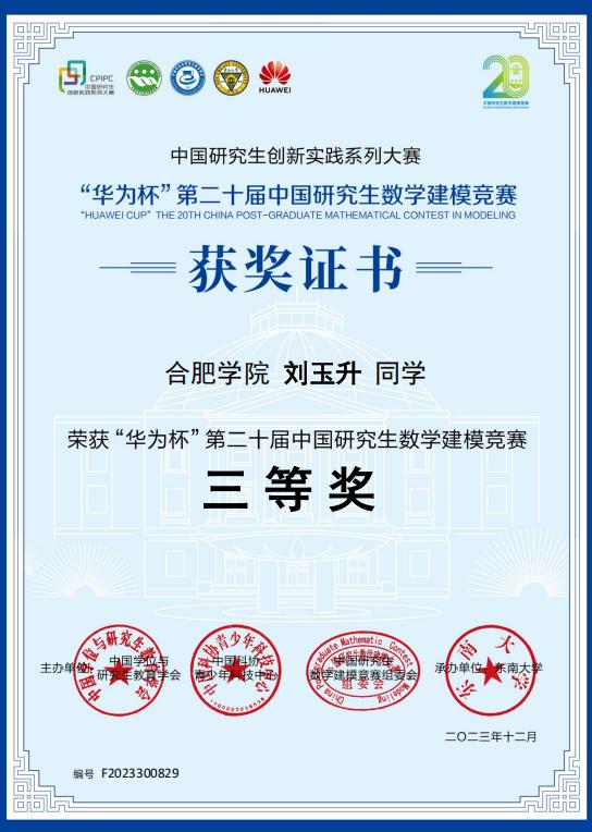 劉玉升始終秉持“以賽促學(xué)、以賽促研”的理念,積極參與各類高水平學(xué)科競賽,在實(shí)踐中不斷拓展學(xué)術(shù)視野、提升創(chuàng)新能力。在2023年“華為杯”第二十屆中國研究生數(shù)學(xué)建模競賽中,他帶領(lǐng)團(tuán)隊克服重重困難,最終榮獲國家三等獎。