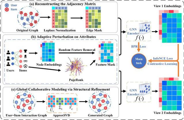 針對上述問題,劉玉升所在團(tuán)隊提出了一種基于鄰接矩陣重構(gòu)與屬性自適應(yīng)擾動的圖增強(qiáng)方法,能夠在保持原始語義信息的同時,自適應(yīng)地去除圖中的噪聲干擾,從而提升推薦系統(tǒng)的性能與泛化能力。項(xiàng)目組通過長達(dá)16個月的持續(xù)攻關(guān)(包括10個月的反復(fù)實(shí)驗(yàn)驗(yàn)證與6個月的論文撰寫與修改),研究成果《Graph Augmentation Empowered Contrastive Learning for Recommendation》發(fā)表于CCF-A類國際權(quán)威期刊《ACM Transactions on Information Systems》。