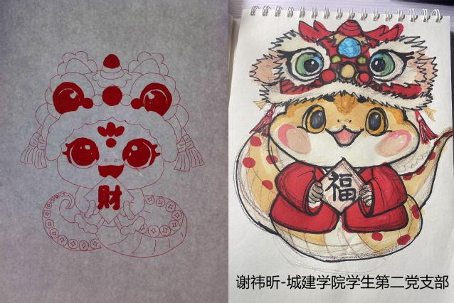 春節(jié),是中華民族最隆重的傳統(tǒng)節(jié)日,積淀了深厚的文化底蘊(yùn),凝聚著中華民族的精神追求、價(jià)值理念和道德規(guī)范。2025年春節(jié)是我們共同歡度的首個(gè)“非遺春節(jié)”。支部黨員在寒假期間以蛇年春節(jié)為主題,通過(guò)繪畫(huà)的方式把“蛇”與“?!眱蓚€(gè)元素相融合,設(shè)計(jì)制作出一幅幅充滿節(jié)日喜慶的作品,表達(dá)對(duì)新年的美好祝愿,傳遞著濃濃的中華傳統(tǒng)文化氣息。