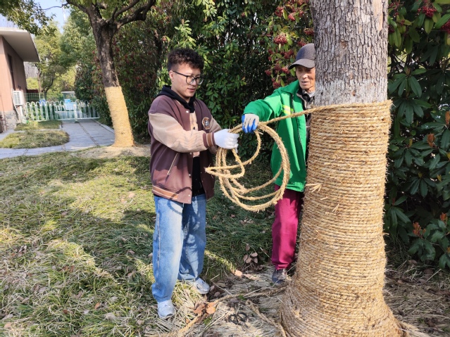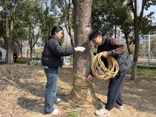 活動(dòng)伊始,在公園管理處工作人員的安排下,園林工作人員對同學(xué)們進(jìn)行了簡單的培訓(xùn),演示大樹“脫衣”過程,講解技巧與細(xì)節(jié)。學(xué)生黨員們積極熱情地投入勞動(dòng)中,耐心解開防風(fēng)麻繩,收拾整齊,以便日后回收利用。遇到粗壯的大樹,學(xué)生們兩兩配合,經(jīng)過幾個(gè)小時(shí)的努力,志愿者們終于完成了所有的任務(wù)。