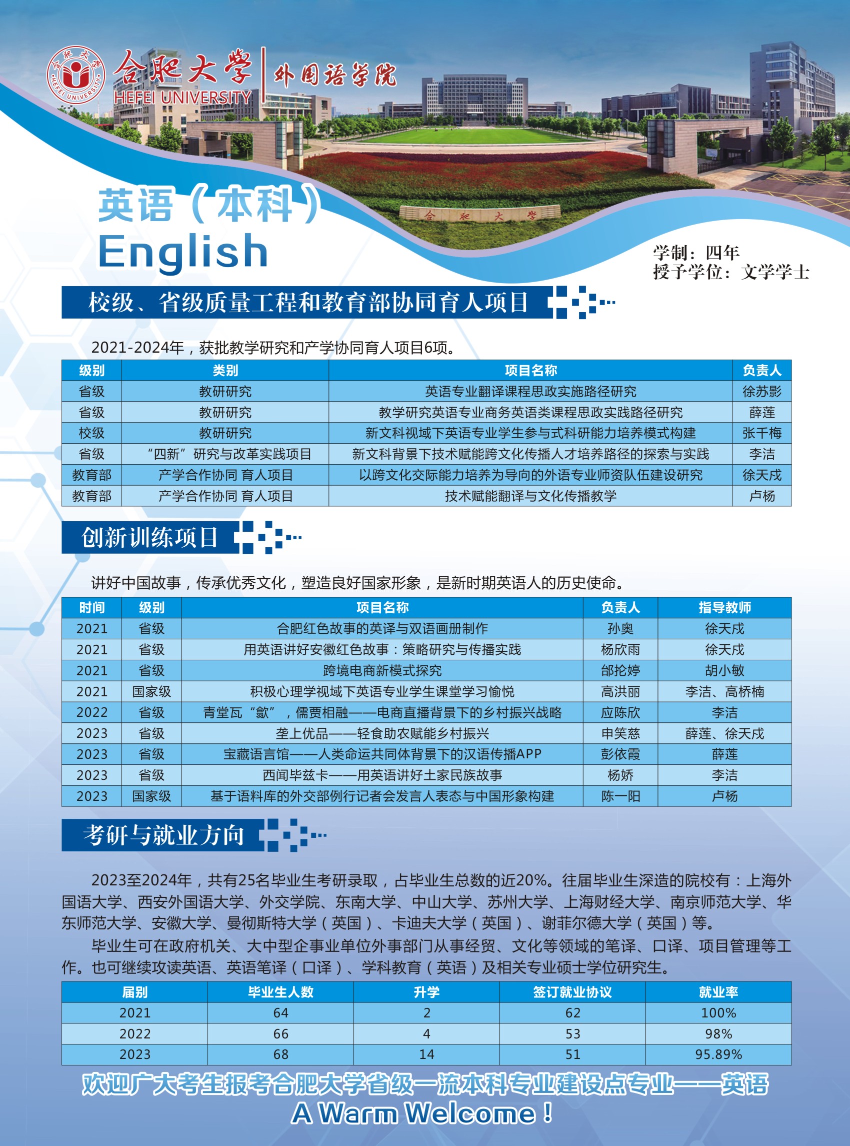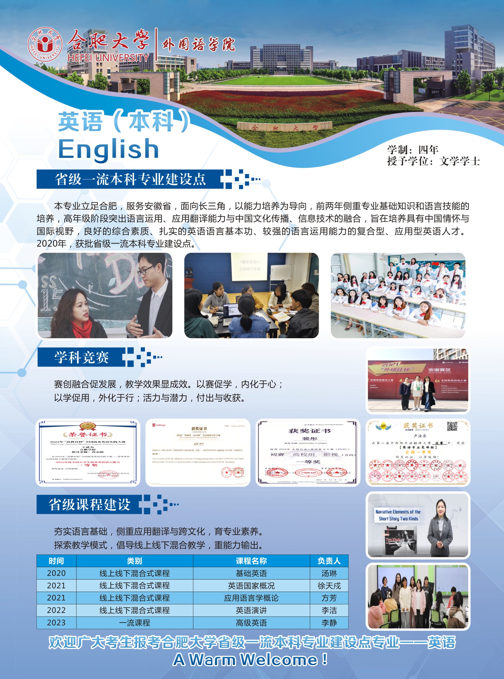 培養(yǎng)目標及特色:本專業(yè)培養(yǎng)德、智、體、美、勞全面發(fā)展,具有良好的綜合素質、扎實的英語語言基本功、較強的語言運用能力和應用翻譯能力、厚實的英語專業(yè)知識和必要的英語教育或商務英語專業(yè)知識與技能,能適應安徽、合肥與環(huán)巢湖地區(qū)區(qū)域經濟一體化發(fā)展和對外宣傳需要,可熟練使用英語從事涉外行業(yè)、語言服務行業(yè)和英語教育教學等項目管理、應用翻譯、教學等相關工作的具有較高跨文化傳播能力的復合型、應用型英語人才。本專業(yè)注重自主學習平臺建設,打造分層次的集中實踐和課內實踐教學體系,開拓應用能力培養(yǎng)的課內外輸出路徑,提升了學生講述中國故事、安徽和合肥外宣話語的寫作、演講、翻譯和闡釋能力。