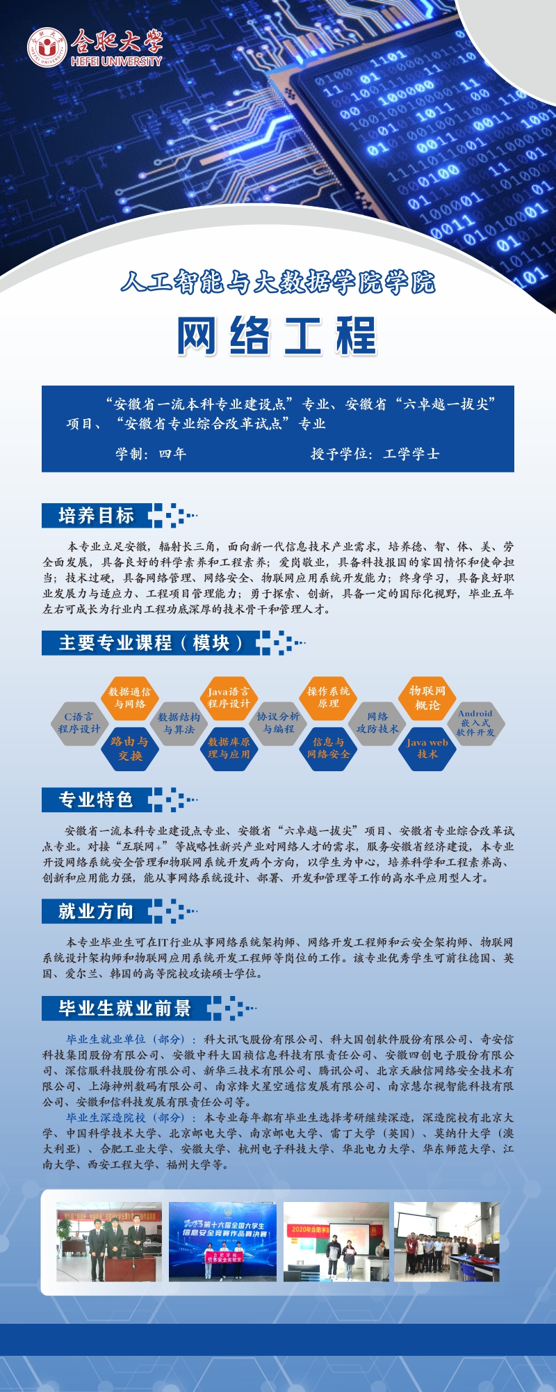 培養(yǎng)目標及特色:本專業(yè)立足安徽,輻射長三角,面向新一代信息產(chǎn)業(yè)發(fā)展需求,培養(yǎng)德、智、體、美、勞全面發(fā)展,具備良好的科學素養(yǎng)和工程素養(yǎng),具有網(wǎng)絡基礎、網(wǎng)絡協(xié)議、網(wǎng)絡管理和網(wǎng)絡安全等方面扎實的理論基礎,并通過提出問題、分析問題、自主學習來解決復雜網(wǎng)絡工程問題,能夠從事計算機網(wǎng)絡系統(tǒng)的分析、設計、集成、開發(fā)、測試、運行維護和管理的高素質(zhì)工程應用型人才。